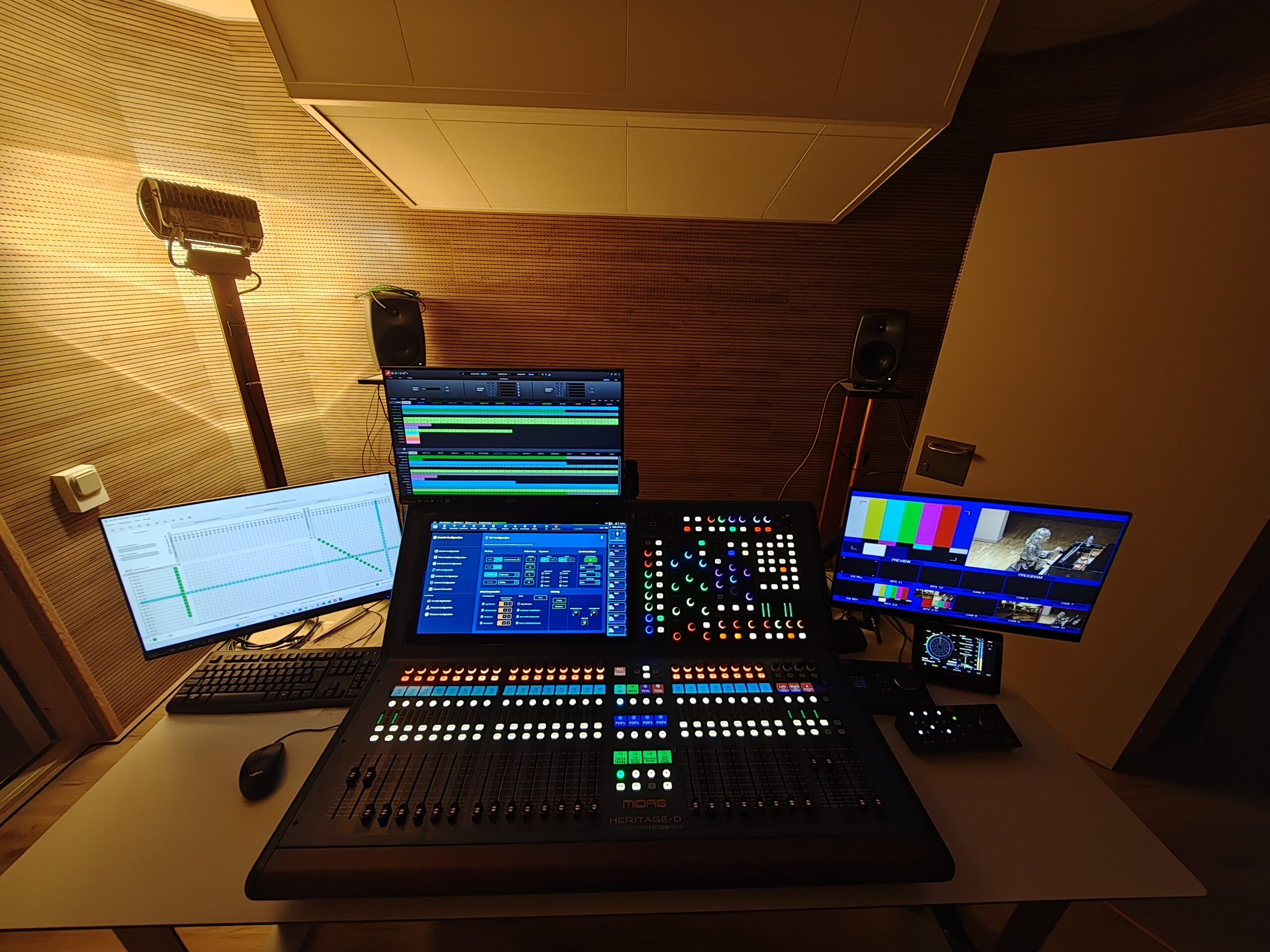 Para la grabación multipista y postproducción profesional, se ha instalado una estación DAW con Sequoia Pro 17 de Magix, capaz de gestionar 512 entradas, edición no destructiva, crossfades asimétricos, cortes multisincrónicos y uso de plugins VST. El sistema se complementa con herramientas de calibrado y monitorización profesional, incluyendo autoajustador de escuchas Genelec, medidor de loudness Clarity M y analizador FFT RiTA de Global Audio, garantizando precisión y control total del audio en todas las fases del flujo de trabajo.