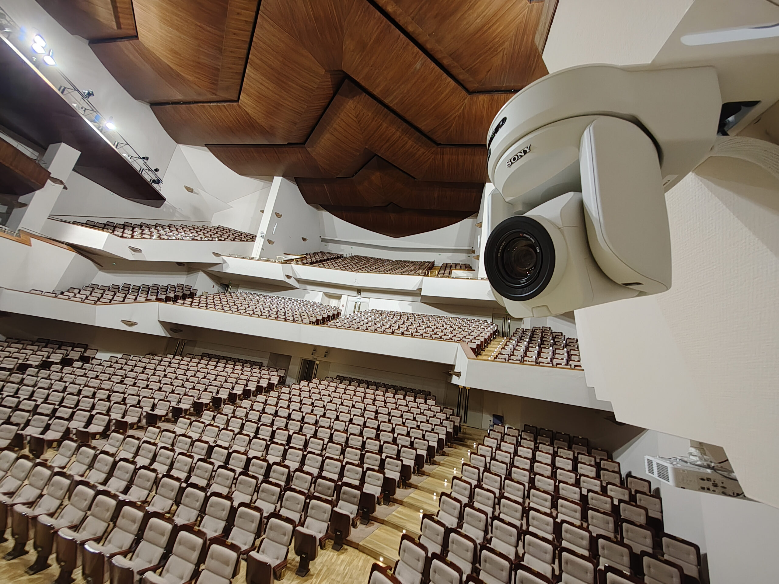 El primer componente de la cadena de captura de imagen lo constituyen las cámaras PTZ Sony BRC-X1000, seleccionadas por su resolución 4K y elevada sensibilidad lumínica, lo que permite la adquisición de imágenes de alta calidad incluso en condiciones de iluminación reducida. Estas unidades se han distribuido estratégicamente para cubrir de manera integral tanto la Sala Sinfónica como la Sala de Cámara, garantizando cobertura total del escenario. Cada cámara dispone de un zoom óptico de 12 aumentos, ampliable mediante la función Tele, lo que permite al operador realizar paneos precisos sobre áreas específicas, así como capturar detalles finos, como la ejecución instrumental de los músicos, sin pérdida de definición. La configuración del sistema facilita la conmutación entre planos detallados y vistas generales mediante posiciones angulares predefinidas, optimizando la visualización completa de la orquesta y la sala, asegurando un flujo de imagen continuo y versátil para la producción audiovisual profesional.